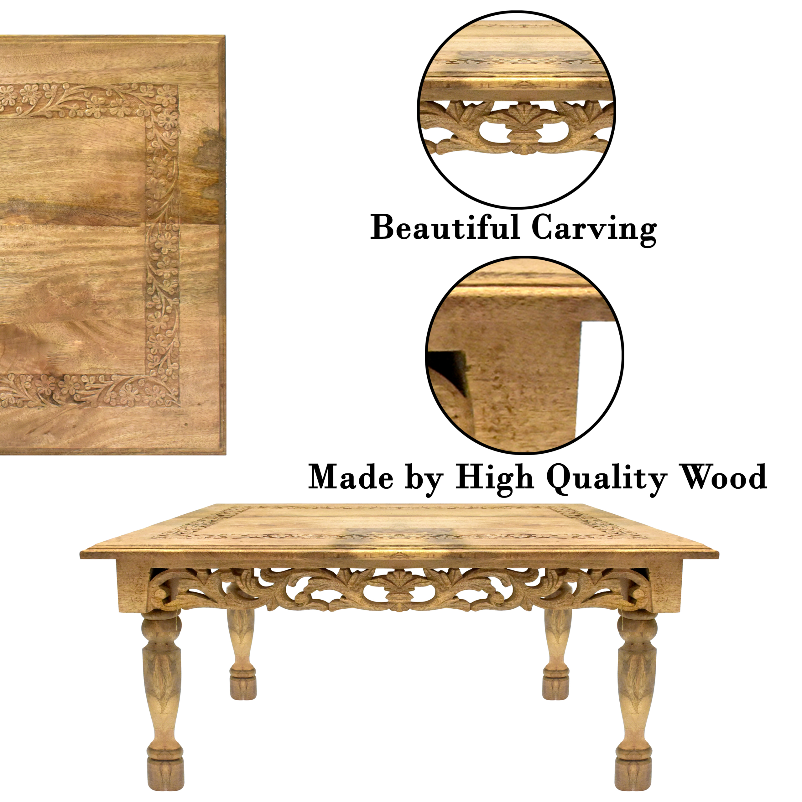 Imagine serving evening tea on a gorgeous carved wooden table, or setting down your laptop for some relaxed work hours, or displaying a vase of fresh flowers that immediately draws compliments. This coffee table makes all of that possible while giving your home a touch of timeless elegance.
