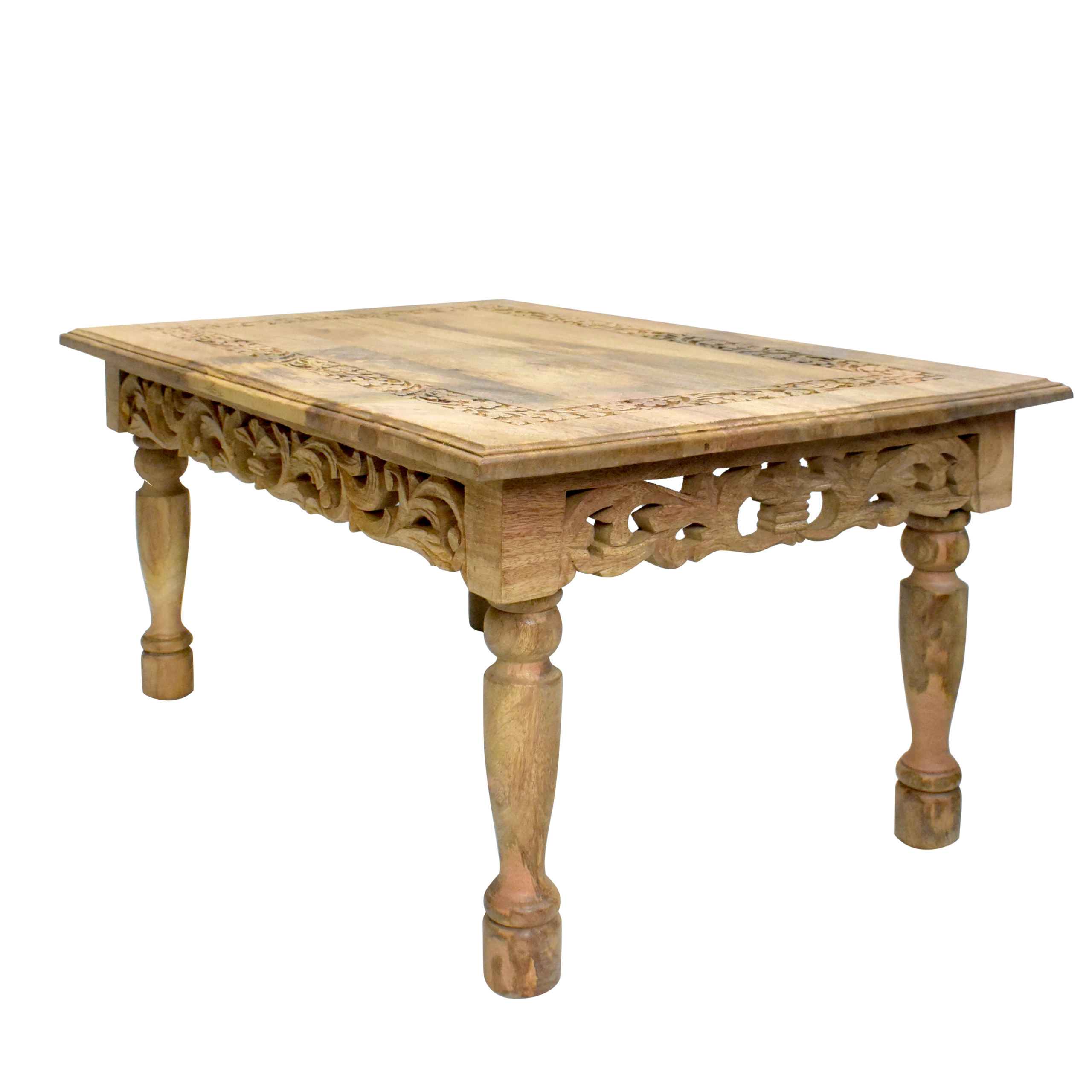 The highlight of this table is its intricate hand-carved floral design along the borders and apron. These delicate carvings showcase the skill of traditional craftsmanship, turning a functional coffee table into a work of art. It’s not just a table; it’s a conversation starter.