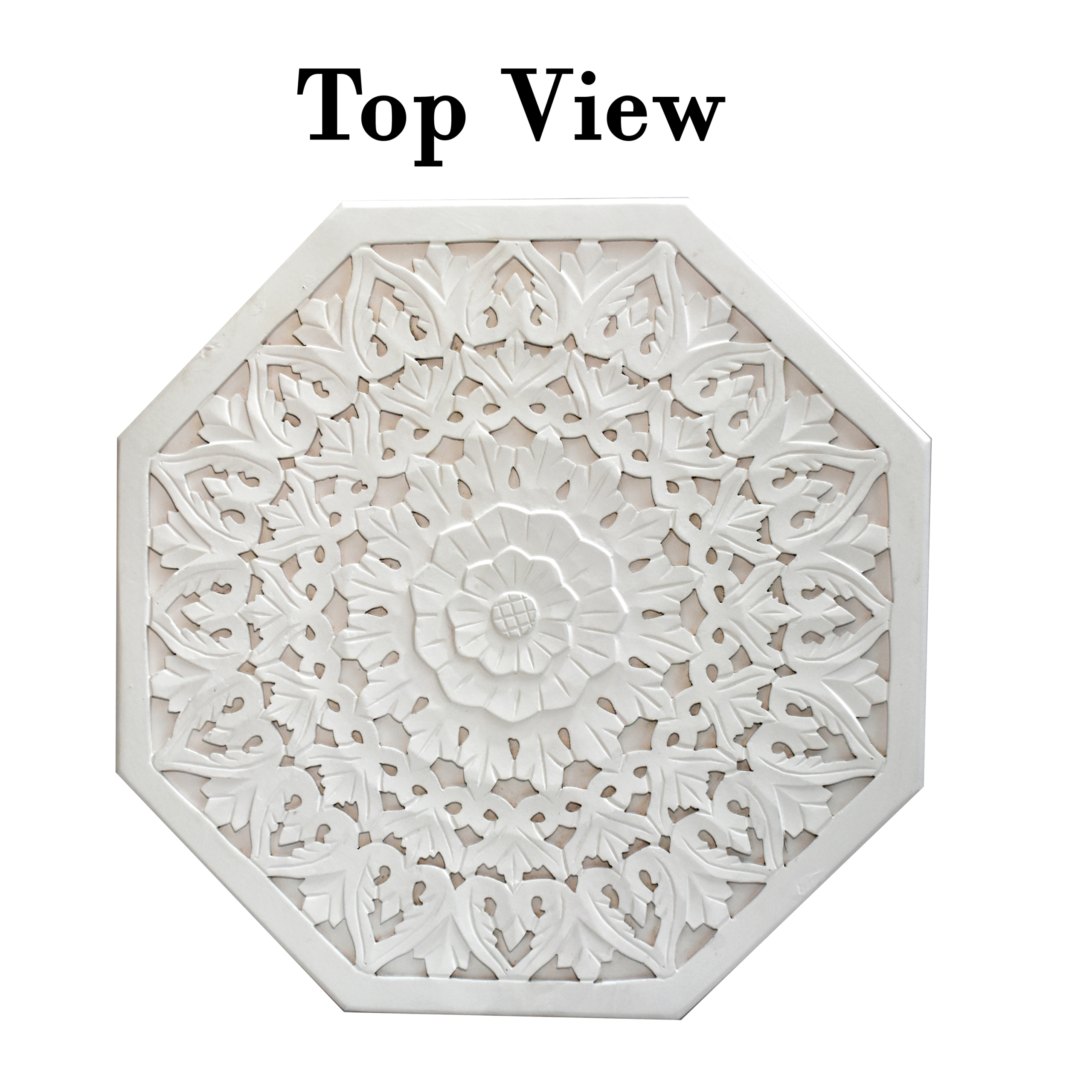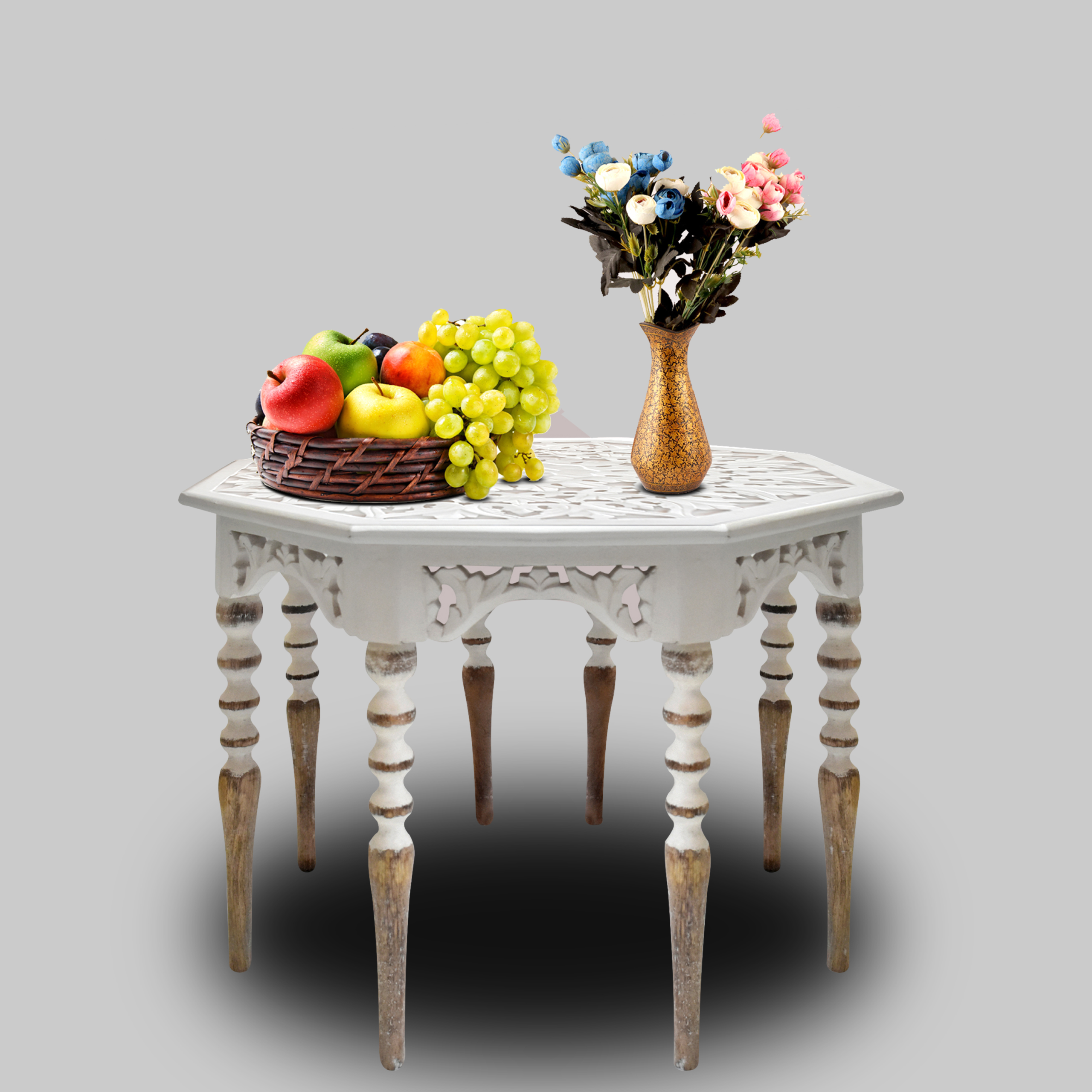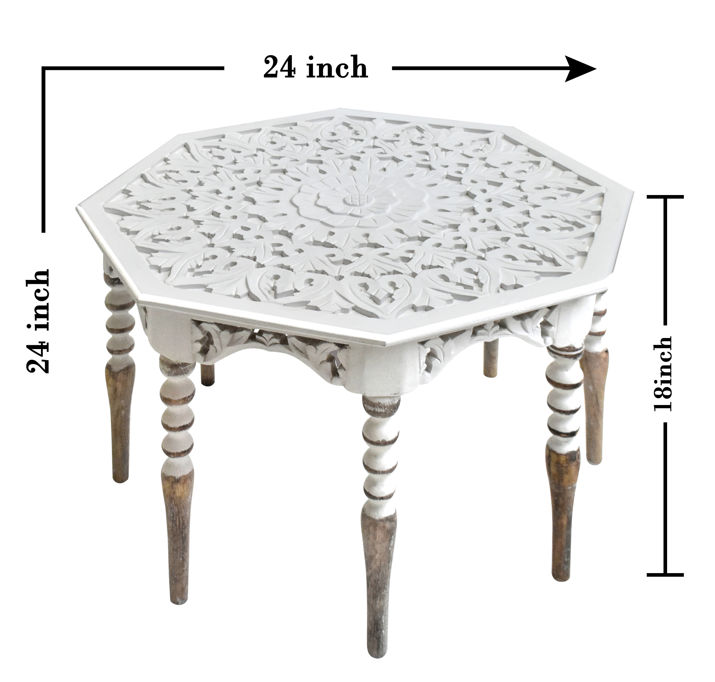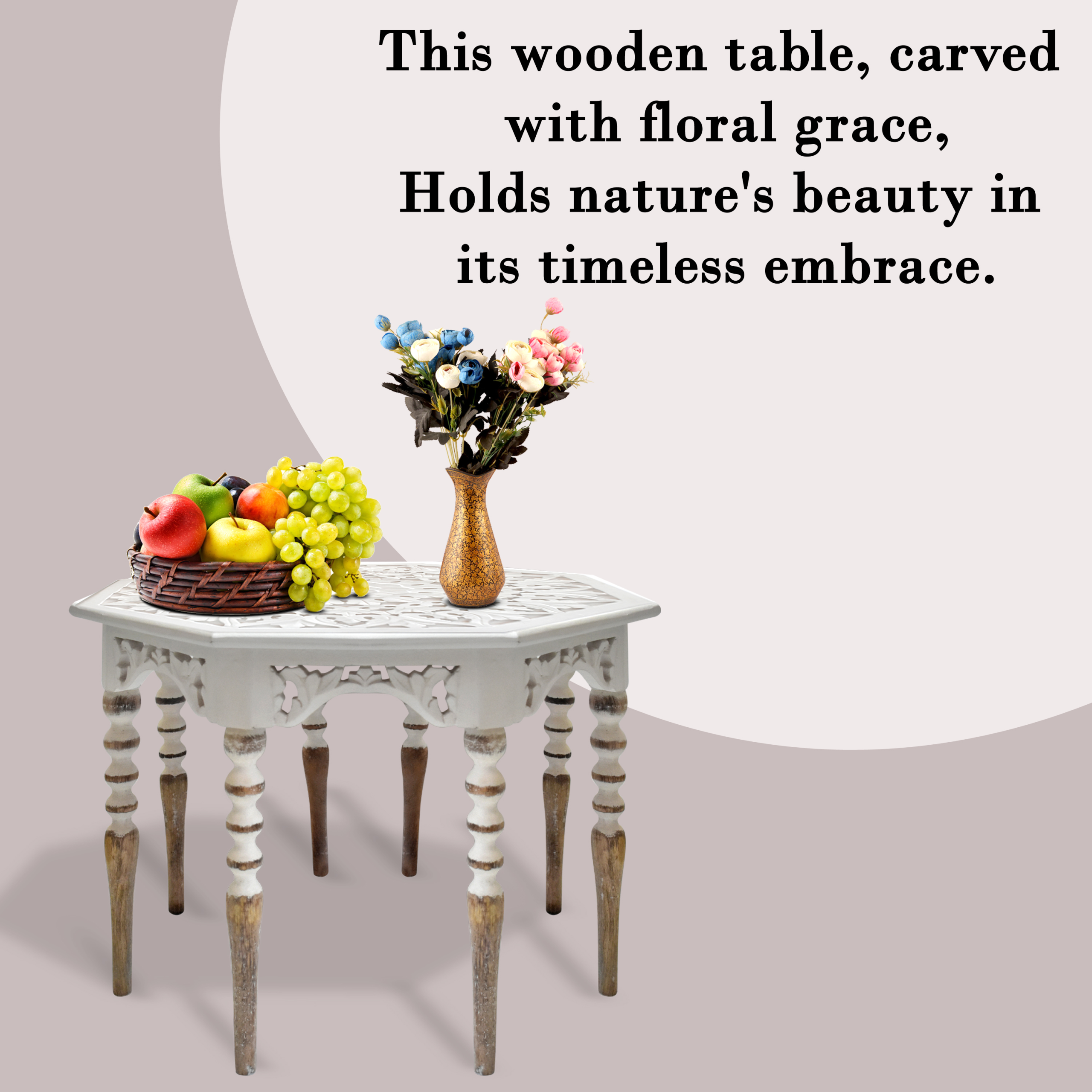 Crafted from premium-grade mango wood, known for its strength, durability, and rich natural grain, this hand-carved center table features an octagonal top adorned with stunning floral motifs.