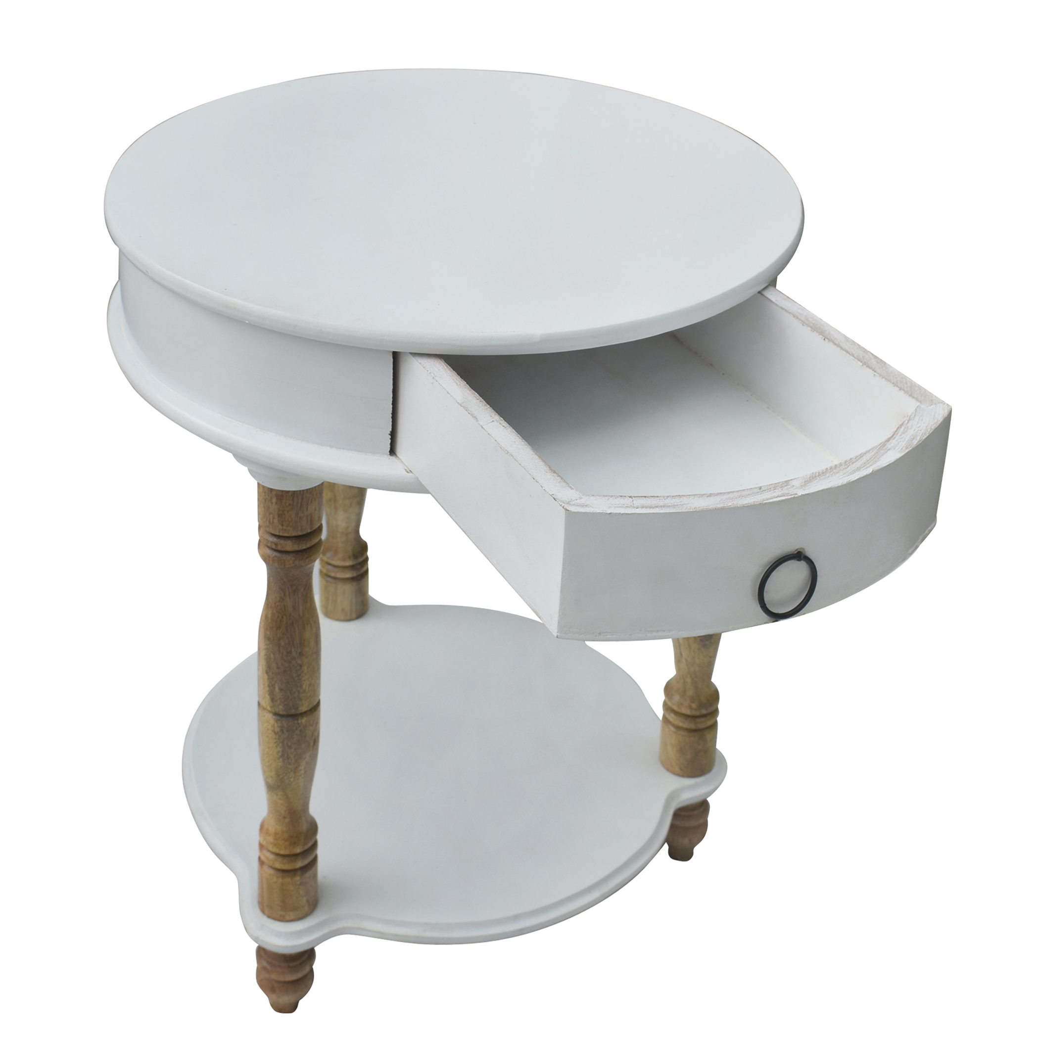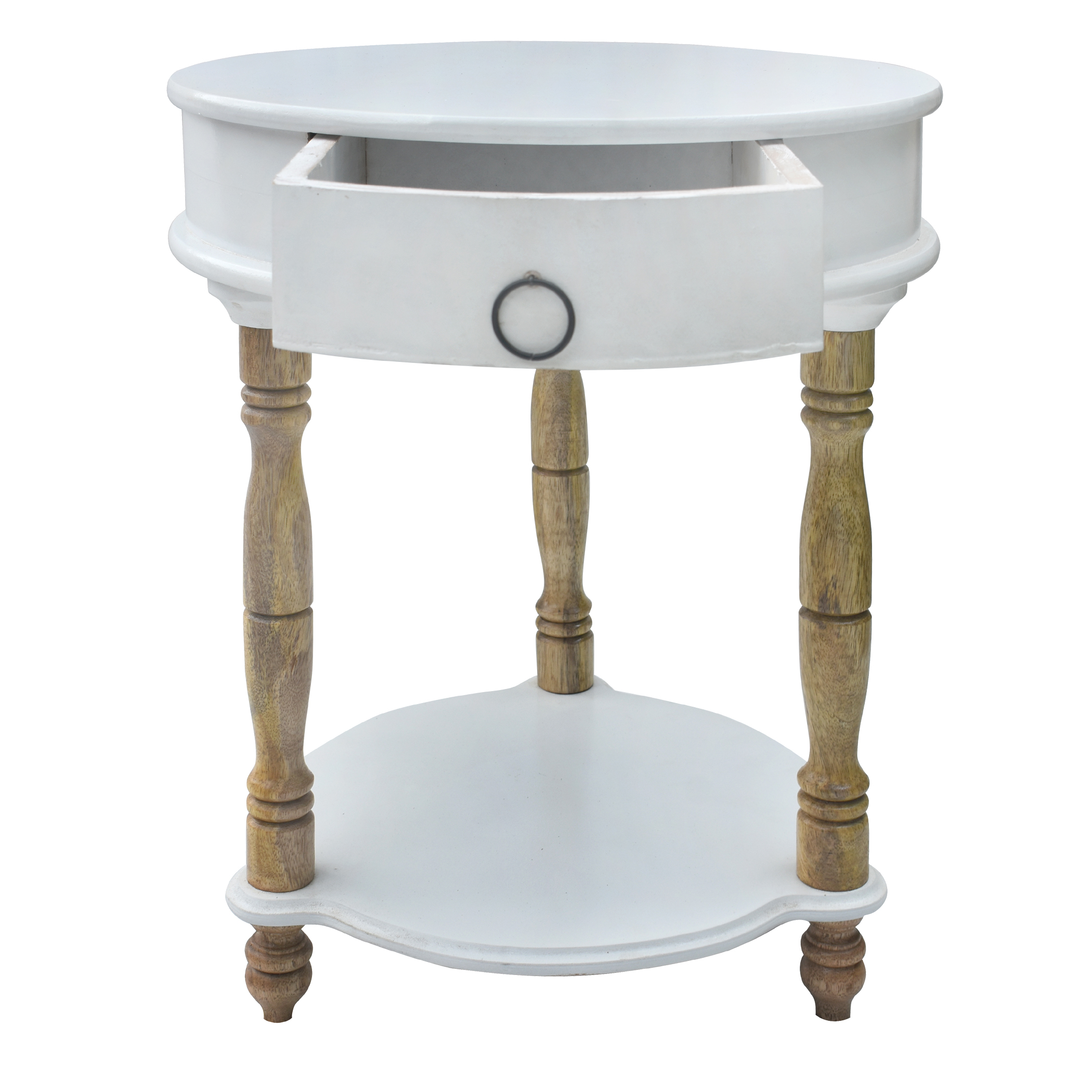 Design: Round tabletop, single drawer, open bottom shelf
